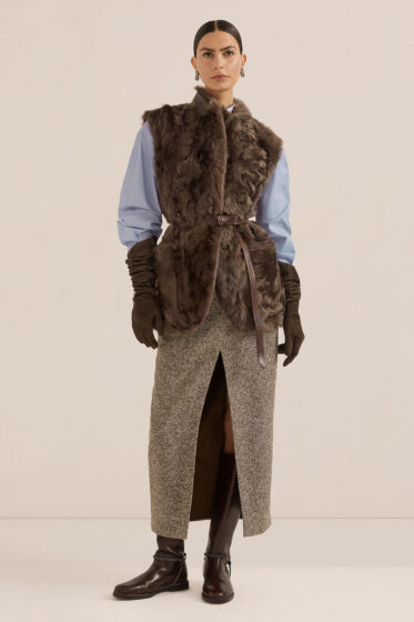 Os acessórios desempenham um papel essencial na coleção, elevando o conceito de sofisticação com detalhes artesanais. Botas, cintos e luvas compõem um jogo refinado entre couros macios e acabamentos meticulosos, trazendo um charme atemporal às produções. A paleta de cores transita entre tons suaves e naturais, como off-white e cáqui, contrastando harmoniosamente com nuances profundas de borgonha e marrom, criando uma atmosfera de elegância equilibrada.