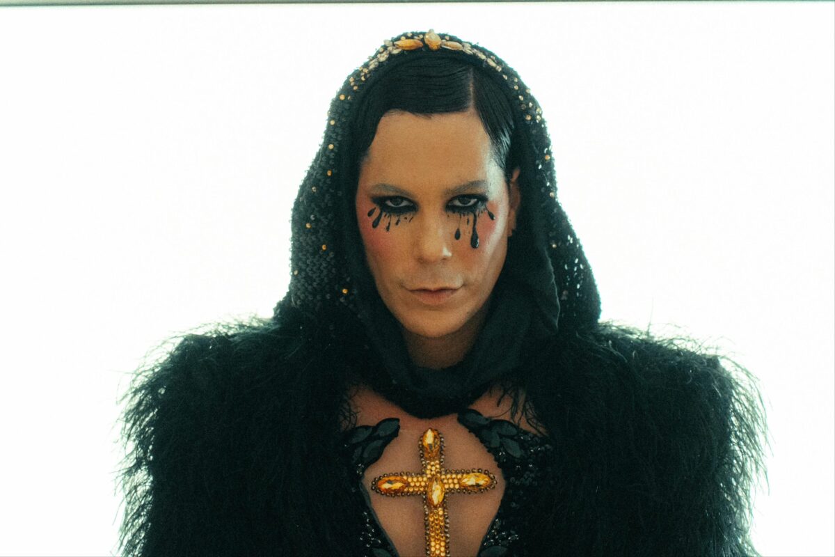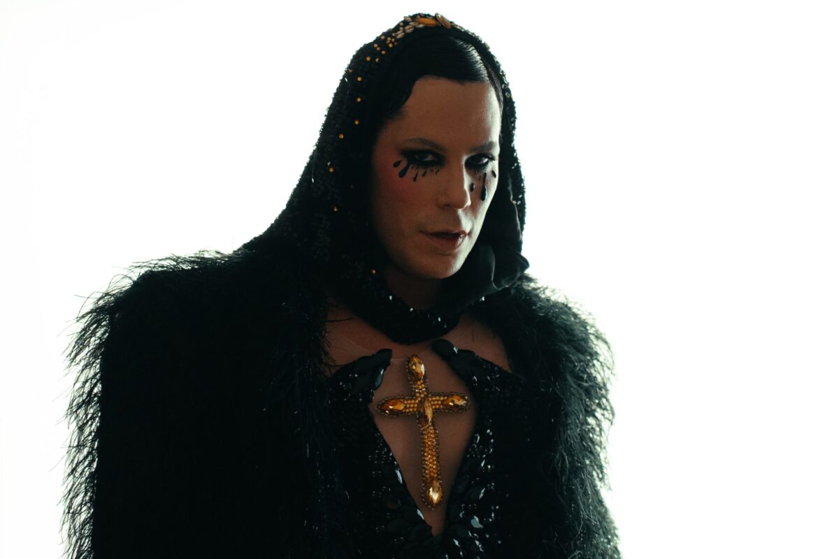Com uma proposta que mistura o sagrado e o contemporâneo, Christian usa um longo casaco de pele preto, que adiciona um ar de imponência e mistério à produção. Por baixo, o destaque vai para um macacão justo com luvas na mesma tonalidade, adornado com uma cruz central dourada, elemento marcante que remete à essência e narrativa do seu próximo projeto.