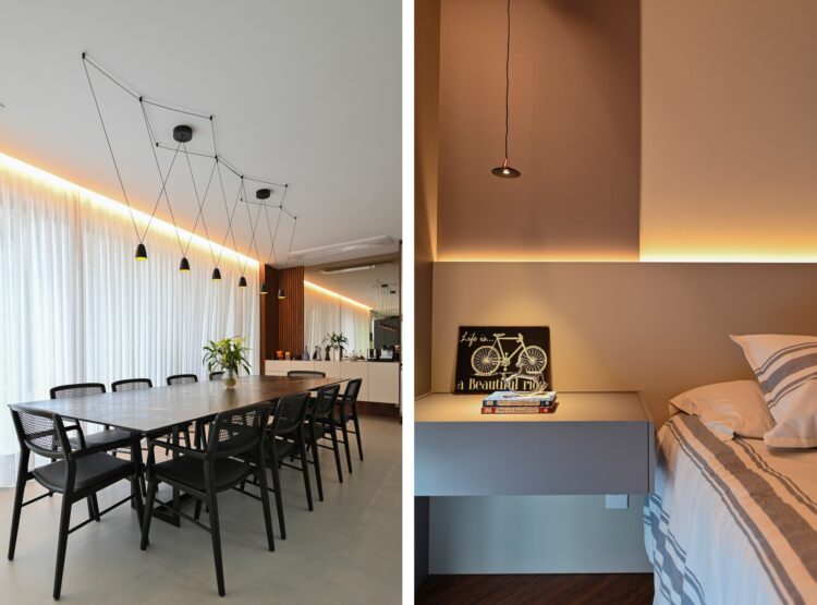“Gostamos de incluir diversos cenários em casa por meio dos diferentes efeitos de iluminação”, diz o arquiteto. Isso vale para momentos de descanso, trabalho, refeições, festividades ou até mesmo acompanhando as variações dos momentos do dia, onde cada horário demanda um tipo de iluminação – com uma luz mais leve ou forte, assim como uma temperatura de cor mais quente ou fria.