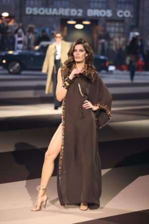 Isabeli, que se apresentou na marca em 2003, pela primeira vez, quando encerrou o desfile, vivenciou muitas mulheres ao longo dessas décadas e ajudou a imprimir a trajetória da DSQUARED. “Já vivi tantas mulheres para dsquared ao longo destes 30 anos que a marca comemora hoje… já fui frequentadora de festival de música daquelas que se jogam até as botas ficarem cheias de lama; outra mais sedutora, mas com uma certa inocência; já vesti brilho, franjas, chapéu… a essência deles é ser arrojados, pouco convencionais, cheia de misturas e referências do country ao pop e pude participar dessa história que estamos celebrando aqui em Milão. Quando eu penso em Dsquared sempre me vem à cabeça apresentações meio formato de show, desfiles-espetáculos que permite que a gente brinque na passarela. Ainda lembro da dancinha que fiz em 2004. Eles sabem se divertir!”, diz Isabeli, momentos antes de adentrar na passarela.