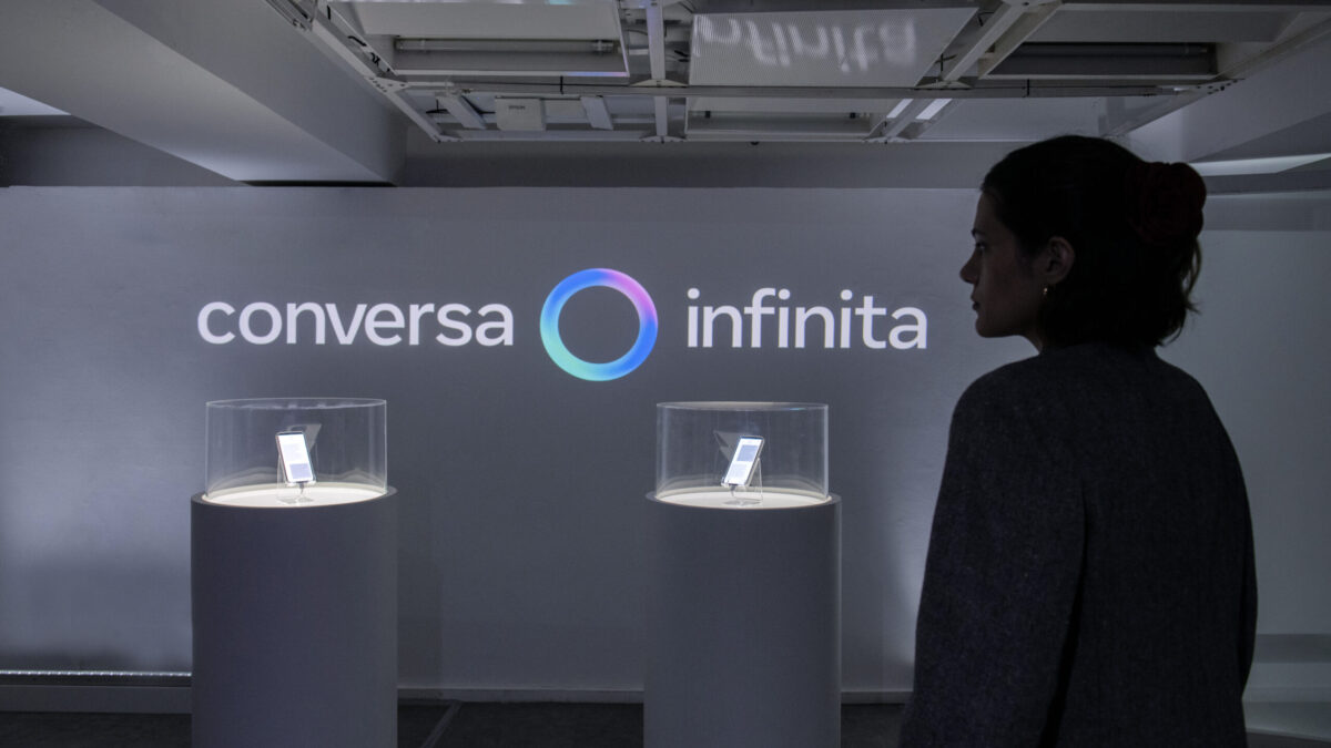 Na instalação, dois dispositivos conectados à Meta AI protagonizam uma conversa contínua, sem fim, simbolizando o potencial ilimitado de diálogo e aprendizado da inteligência artificial. No centro da experiência, porém, está o toque humano: visitantes podem interagir com a tecnologia por meio de um QR code, inserindo seus próprios prompts e transformando a narrativa em tempo real.