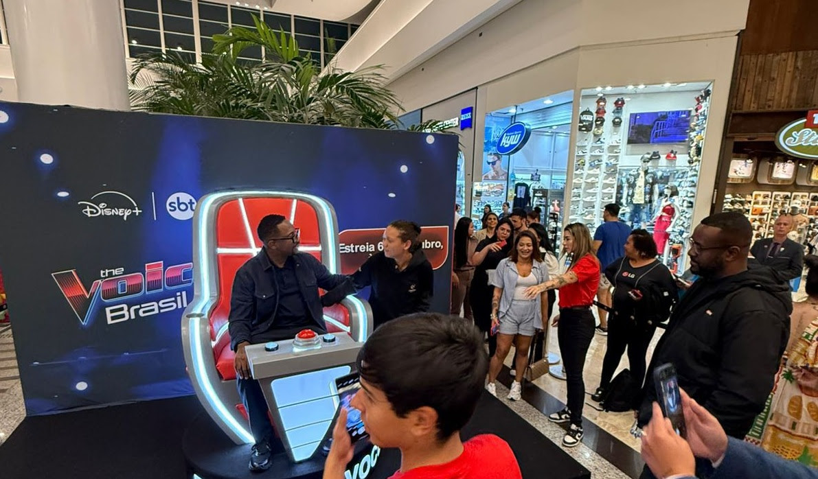 São Paulo, 3 de outubro de 2025 – O SBT e o Disney+ realizaram uma ação especial para promover a nova temporada do The Voice Brasil. A icônica cadeira do reality show foi instalada no Shopping Center Norte, na zona Norte da capital paulista, onde Mumuzinho, um dos técnicos do programa, interagiu com os fãs em um encontro que uniu música, fotos e muita animação.